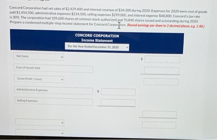Solved Concord Corporation Had Net Sales Of 2 429 400 And Chegg Com